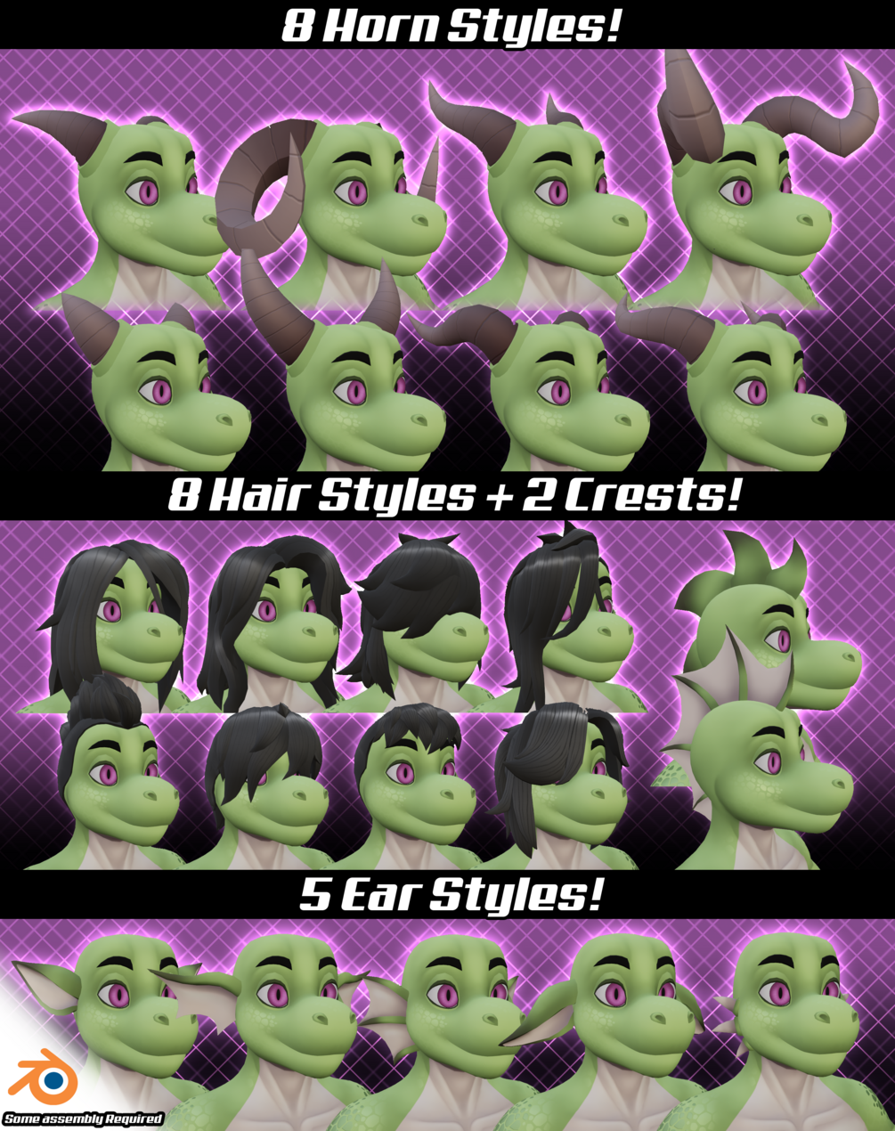 - 9 hair styles, 2 head crests, 10 horn styles, 5 ear styles and 4 tail tips